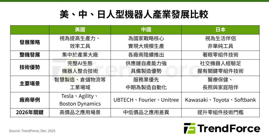 在全球各主要經濟體持續推動人型機器人發展趨勢下,日本廠商持續精進傳動、感測、控制等關鍵零組件技術,以提高替代門檻,和美國、中國業者積極發表終端人型產品的作法形成對比。美、中、日機器人產業鎖定的應用場景各異,於 2026 年也將面臨不同發展節點。