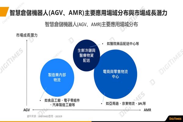 因電商規模持續擴大帶動即時配送需求,倉儲效率成為競爭關鍵。AMR 具備高彈性與自主導航能力,能因應庫存單位 (SKU) 多樣化與動態調度需求,被廣泛應用於電商物流中心、製造業內部物流、生鮮冷鏈與醫療配送等場域。相較於無人搬運車 (Automated Guided Vehicle;AGV),AMR 不需依賴固定軌跡,部署更具彈性,並可透過 AI 與邊緣運算技術實現群體協作與智慧調度,成為智慧物流的核心節點,也因此,AMR 在倉儲場域逐步超越 AGV,AMR 的市場規模 CAGR 預計也將高於 AGV。
